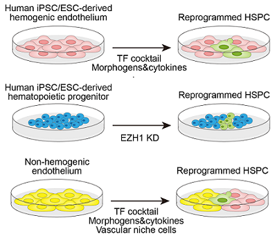 Hemogenic endothelial cells (HECs) or hematopoietic progenitor cells (HPCs) are derived from human induced pluripotent stem cells/embryonic stem cells via embryoid body (EB)-based direct differentiation. The HECs transfected with transcription factor cocktail are capable of giving rise to hematopoietic stem cells (HSCs) with multilineage reconstitution ability. The HPCs with Ezh1 knockdown are capable of giving rise to hematopoietic stem cells (HSCs) with multilineage reconstitution ability.