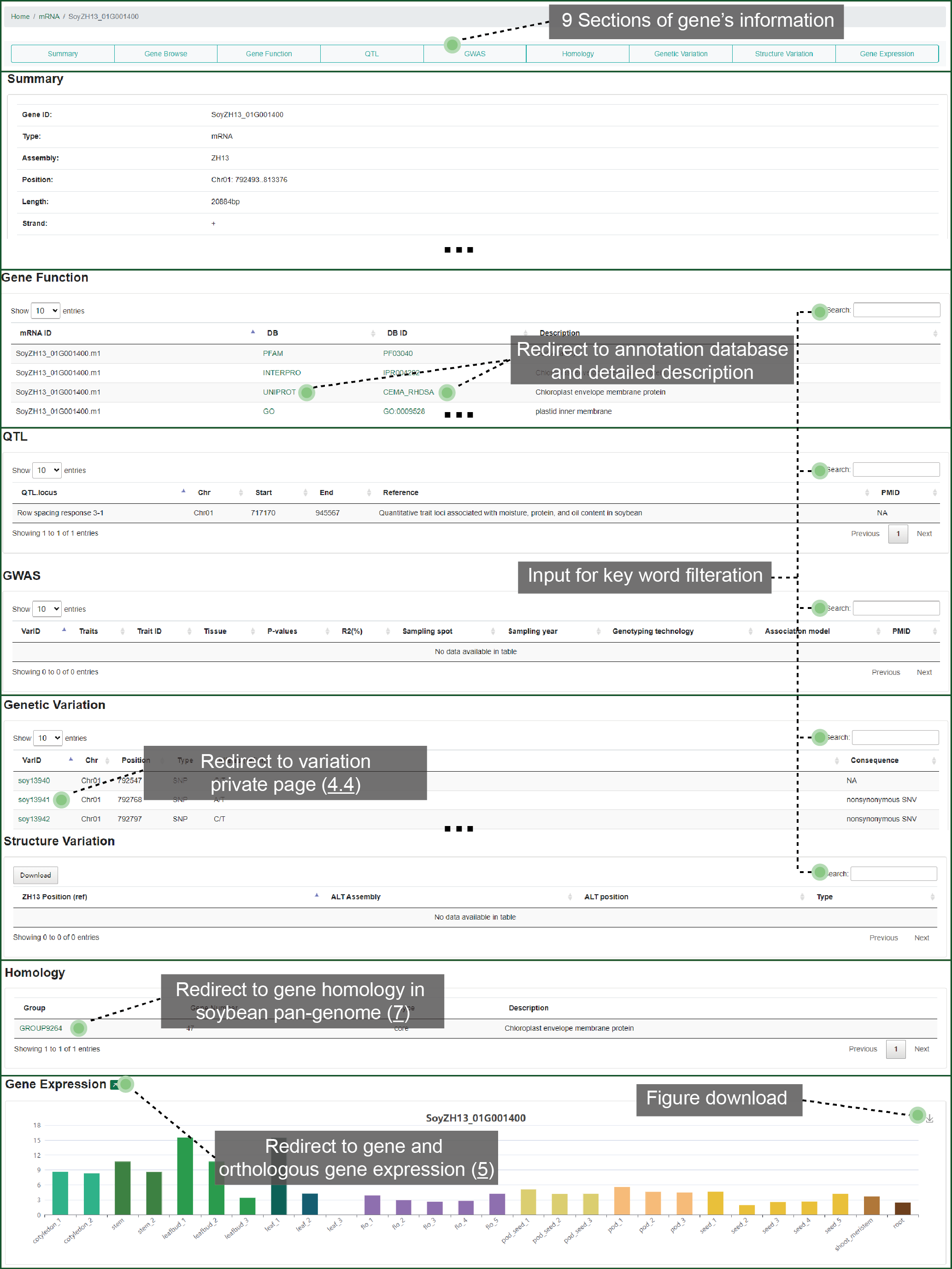We designed exhibition framework for each single gene. This framework shows 9 parts such as basic summary, molecular functional annotation, biological knowledge, overlapped variation, homology, and gene expression pattern. You can fast locate to any part that you are interested in. From this detailed page, you can jump to the variations within the gene, homologous group or expression pattern from the gene's page.